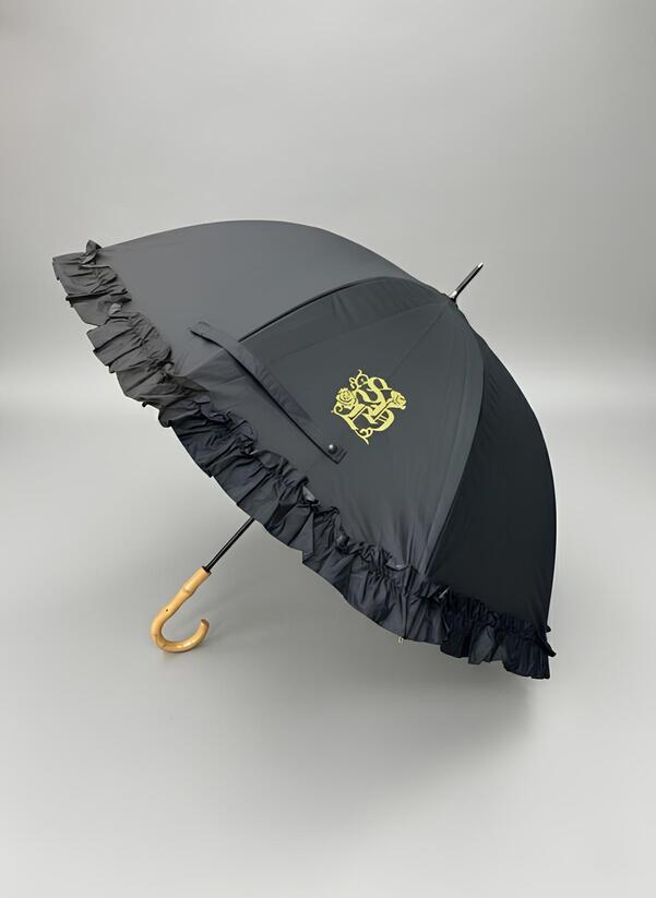 シックなブラックとゴールドのアクセントにフリルを添えたことで、華やかな1本に仕上がりました。晴雨兼用なので、突然の雨にも備えられます。
